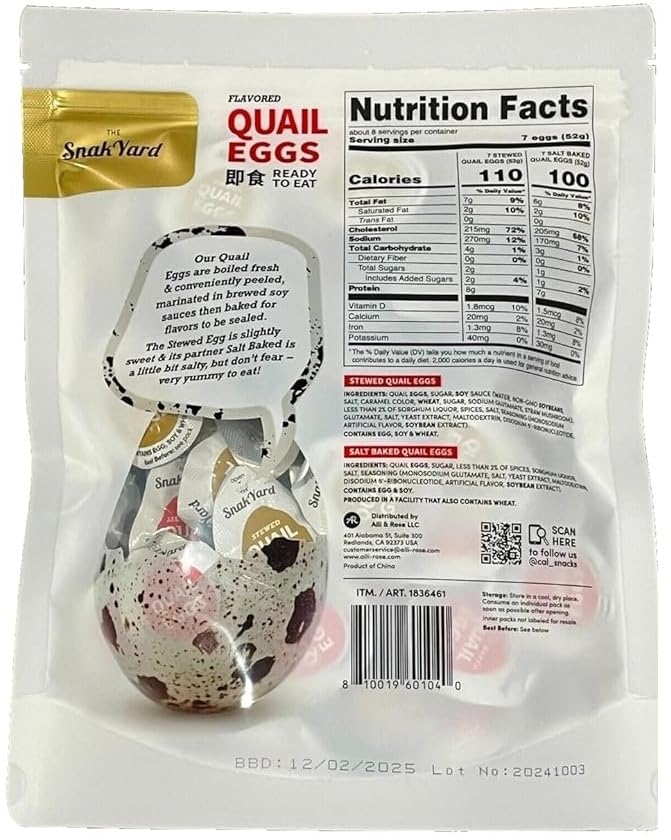 Indulge in the delectable taste of Quail Eggs with Soy Sauce, a perfect blend of sweet, salty, and chewy sensations. Each pack contains individually wrapped servings, offering unparalleled convenience for on-the-go snacking. These smoked quail eggs boast an invitingly rich flavor profile, setting them apart from the ordinary boiled egg. Savor a snack that's both ready-to-eat and protein-rich, providing an excellent source of satiating nutrients in every bite, ideal for busy lifestyles or spontaneous snack cravings.